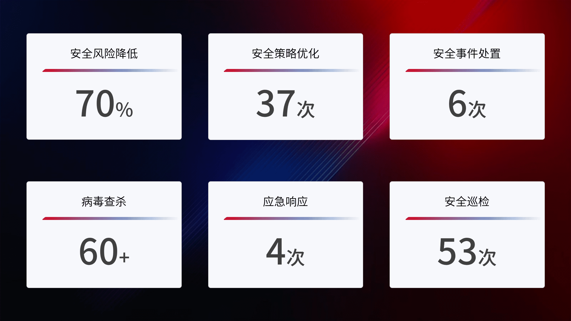 提供全面的安全事件报告体系,,,,包括处置报告、、、周报、、、季度和年度总结,,,,结合持续监控,,,,帮助客户深入了解网络安全状况。。。