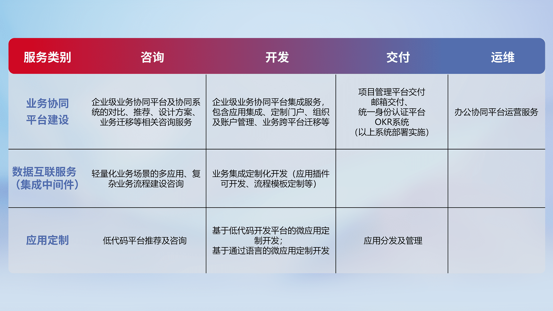 针对钉钉、、、、企微、、、IDaas等平台级产品提供产品的规划、、、方案、、、交付、、、定制化开发等服务,,,实现如统一协同办公、、、、智能客户服务、、混合会议管理、、、智能数据查询、、等业务场景,,实现数字化转型。。